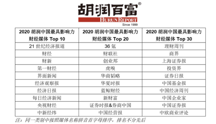 (2020年10月16日,北京)胡潤百富今日發布《2020胡潤中國最具影響力財經媒體榜》(Hurun China Most Influential Business Media Awards 2020)。這是胡潤百富連續第二次發布此榜單。
